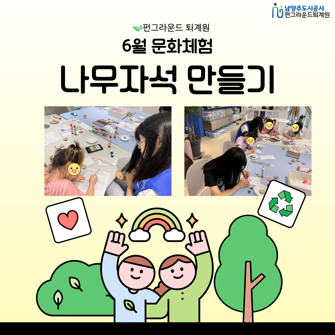 퇴계원 [펀그라운드 퇴계원] 6월 문화체험 작성자 펀그라운드진접 등록일자 2024년 6월 8일 17시 19분 40초 조회 220 펀그라운드 퇴계원 6월 문화체험으로 나무자석 만들기를 진행했습니다~6월 환경의달 맞이 함께 환경을 생각하며 나무자석에 어떤 문구를 적을지 고민고민하며 만들었어요~22일(토)에도 진행하오니 많은 관심 부탁드립니다 :) 퇴_문화체험-sns, 001.png [ Size : 549.28KB, Down : 90 ] 미리보기 다운로드 목록보기