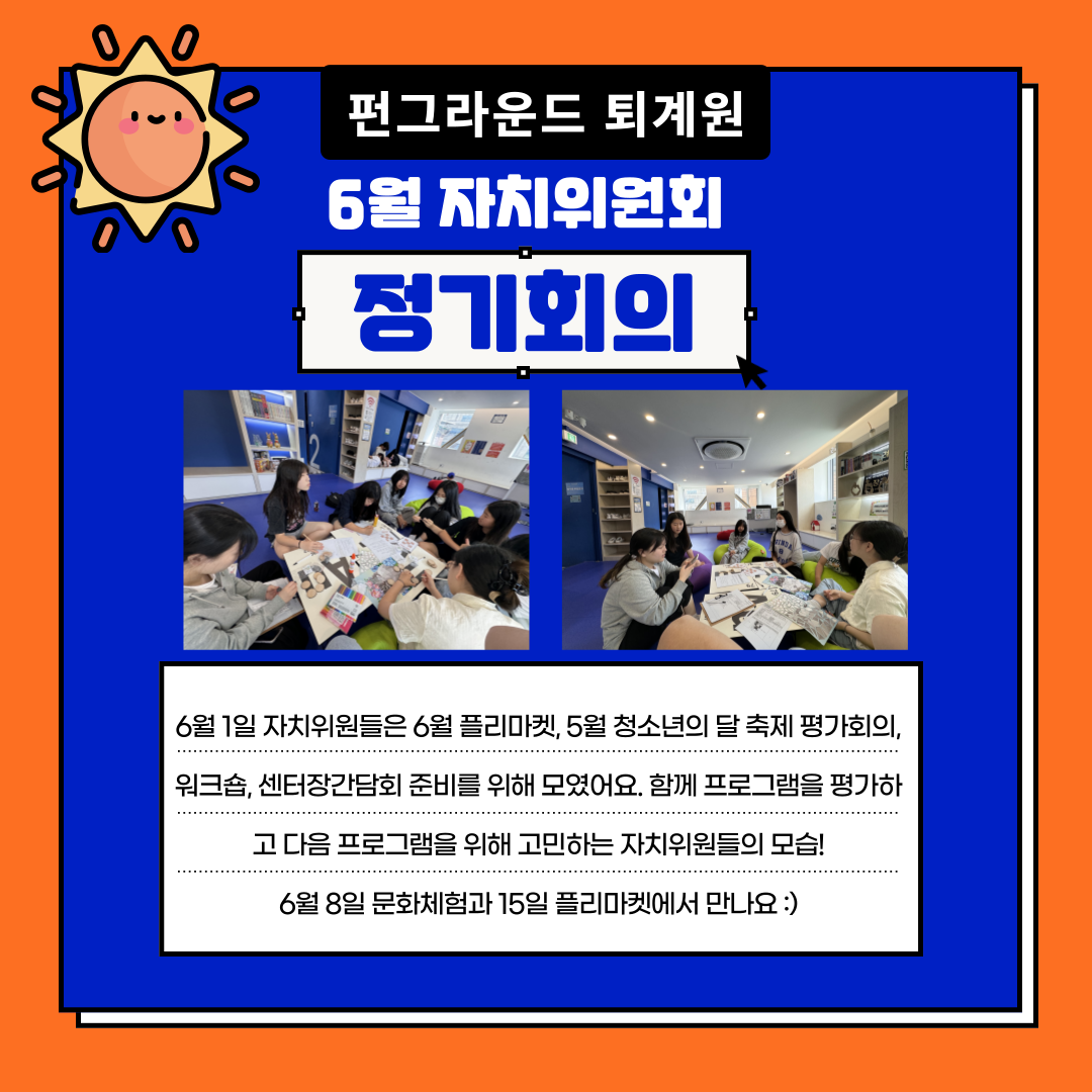 퇴계원 [펀그라운드 퇴계원 청소년자치위원회 정기회의] 작성자 펀그라운드진접 등록일자 2024년 6월 2일 17시 13분 12초 조회 193 [펀그라운드 퇴계원]6월 1일 청소년자치위원회가 모여 정기회의를 진행했어요!6월 회의 안건은 5월 청소년의 달 축제 평가와 6월 문화체험과 15일 플리마켓이였어요~ 안건이 굉장히 많았지만 척척 해나가는 자치위원들! 앞으로의 모습을 기대해주세요~ 06.01.퇴계원-자치위원회-정기회의-001.png [ Size : 418.86KB, Down : 90 ] 미리보기 다운로드 목록보기