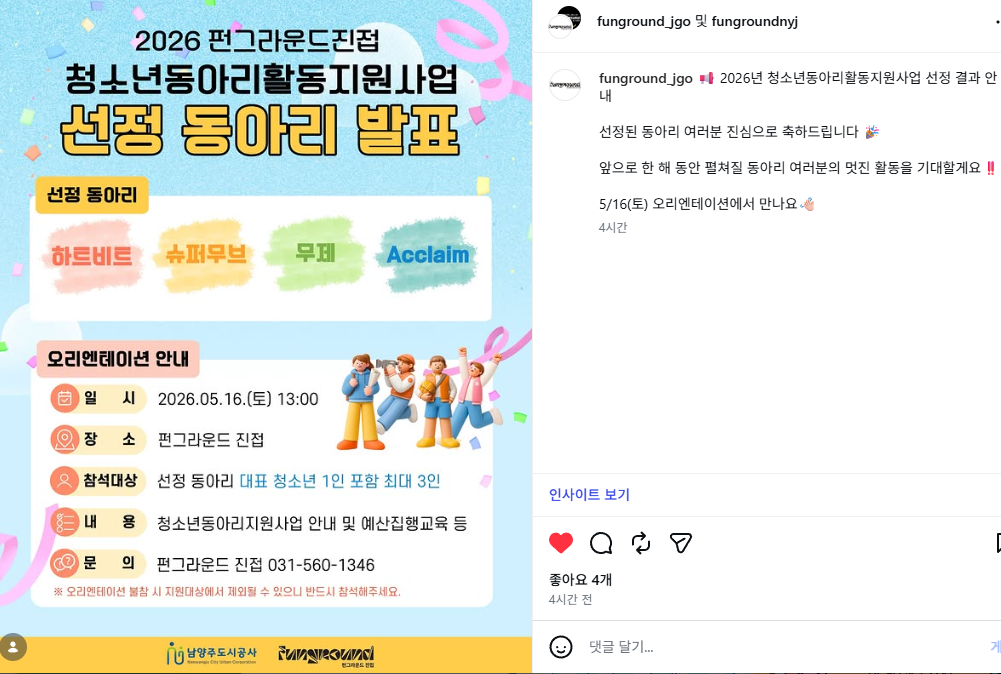 진접 청소년동아리활동지원사업 지원 동아리 선정 발표 작성자 펀그라운드진접 등록일자 2026년 4월 23일 19시 12분 1초 조회 13 KakaoTalk_20260423_185352795.png [ Size : 586.73KB, Down : 3 ] 미리보기 다운로드 목록보기