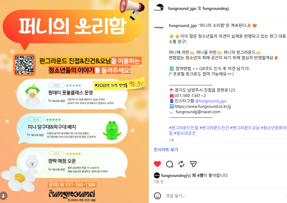 진접 펀그라운드 진접ㆍ진건ㆍ오남 퍼니의 소리함 작성자 펀그라운드진접 등록일자 2026년 4월 23일 19시 8분 25초 조회 10 KakaoTalk_20260423_185233598.png [ Size : 505.21KB, Down : 3 ] 미리보기 다운로드 목록보기