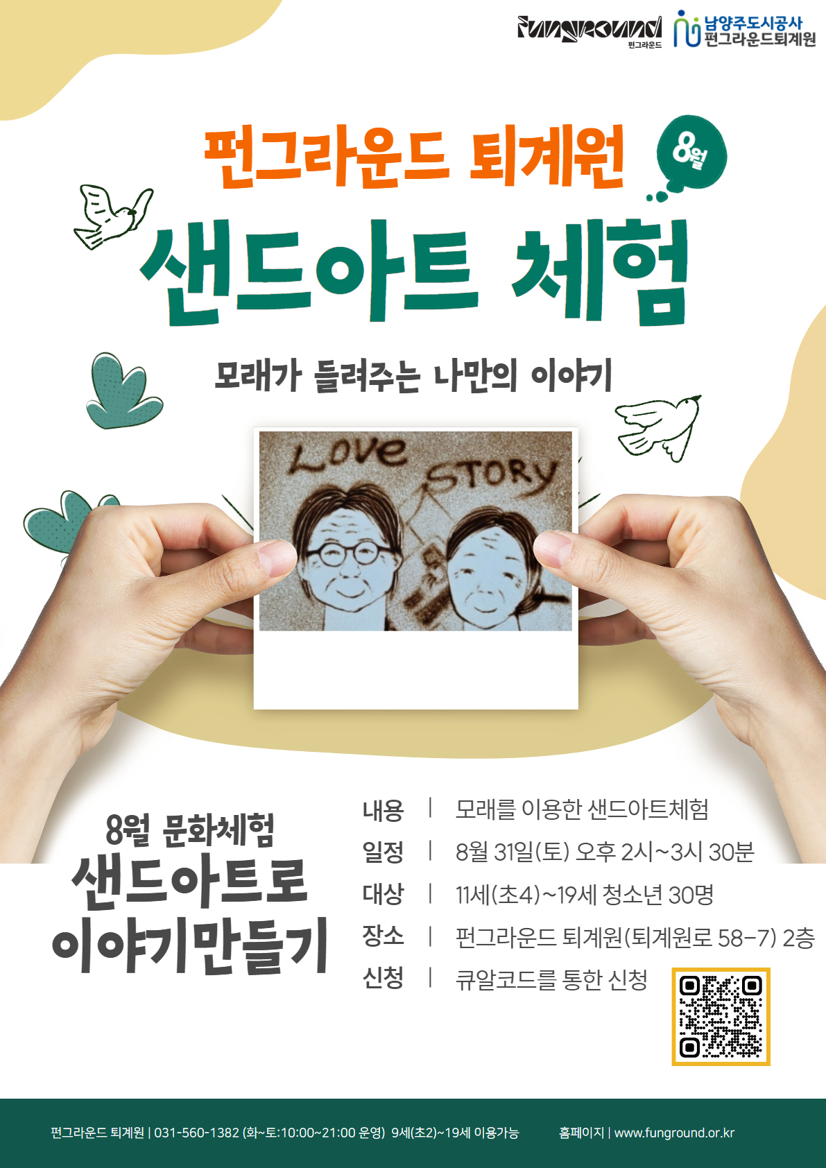 [펀그라운드 퇴계원 8월 문화체험-샌드아트] 8월 31일(토) 샌드아트 공연과 체험으로 진행됩니다. 일시: 8월 31일(토) 오후 2시~3시 30분 장소: 펀그라운드 퇴계원 2층 대상: 초등학교 4학년(11세) ~ 19세 30명 신청방법: 포스터 하단 큐알코드를 통한 신청서 작성하기 신청링크: https://naver.me/5XJ5x9IV 기타: 해당 대상이 아닐경우 신청은 자동취소되오니 꼭 대상을 참고하여주시기 바랍니다. 홈페이지를 통한 신청을 하실 경우 네이버 신청도 진행해주시길 바랍니다! |
