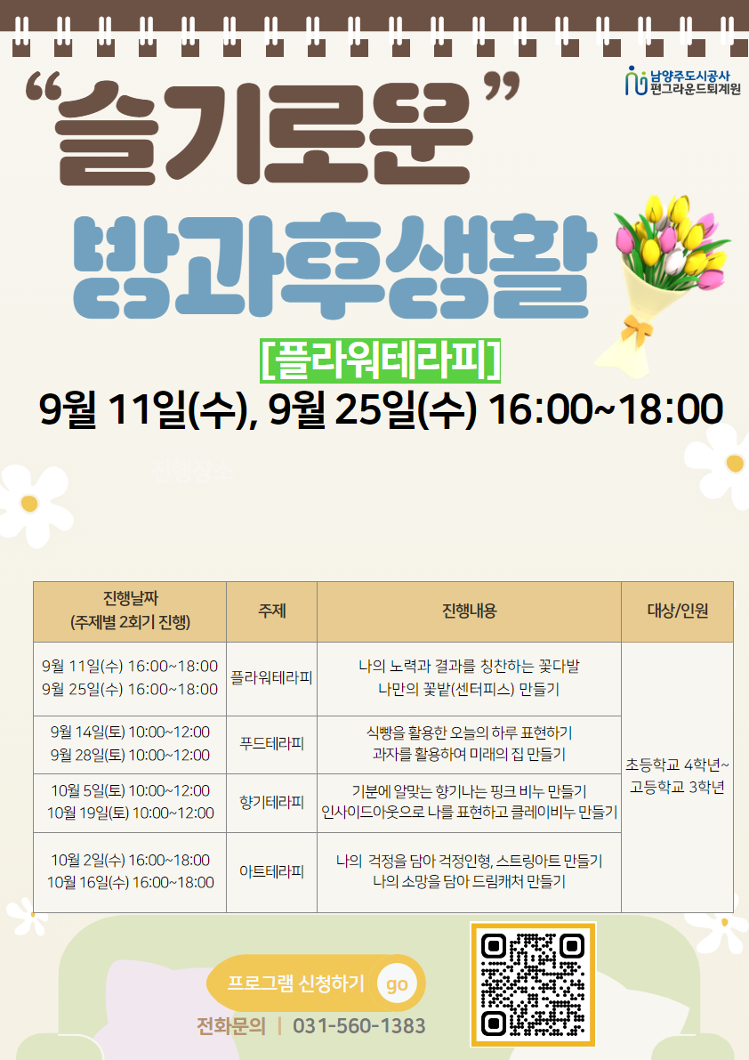 사전접수 마감되었습니다 :) [펀그라운드 퇴계원 슬기로운 방과후생활 - 플라워테라피] 신청기간: 8월 9일(금) ~ 9월 4일(수) 모집대상: 남양주시 거주 초등 4학년 ~ 고등 3학년 모집인원: 12명(네이버 6명, 펀그라운드 홈페이지 6명) 참가비: 무료 진행일시: 9월 11일(수), 9월 25일(수) 오후 4시~6시 진행장소: 펀그라운드 퇴계원(퇴계원로 58-7) 진행내용: 플로리스트와 함께하는 나의 노력과 결과를 칭찬하는 꽃다발 만들기(1회기), 나만의 꽃밭(센터피스) 만들기(2회기) 참고사항 - 모집인원이 50%미만일 경우 진행일자가 변경될 수 있습니다. - 1인당 최대 1개의 주제가 참여가능하며 중복참여가 불가합니다. - 한 주제당 2회기 진행함으로 모두 참석하여야합니다. - 남양주시 거주 청소년이 아니거나 해당나이가 아닐 경우 자동취소됩니다. - 펀그라운드 퇴계원 전용주차장이 없음으로 인근 공영주차장을 이용하여주시기 바랍니다. - 신청 후 취소는 9월 4일(수) 전까지 가능하며 노쇼를 삼가해주시기 바랍니다. - 신청 시 비고란에 참가청소년의 해당학교 학년 이름을 적어주시기 바랍니다. 미작성시 신청순위에서 밀릴 수 있습니다. (남양주시 거주 확인하기 위함) 기타문의: 031-560-1382 |