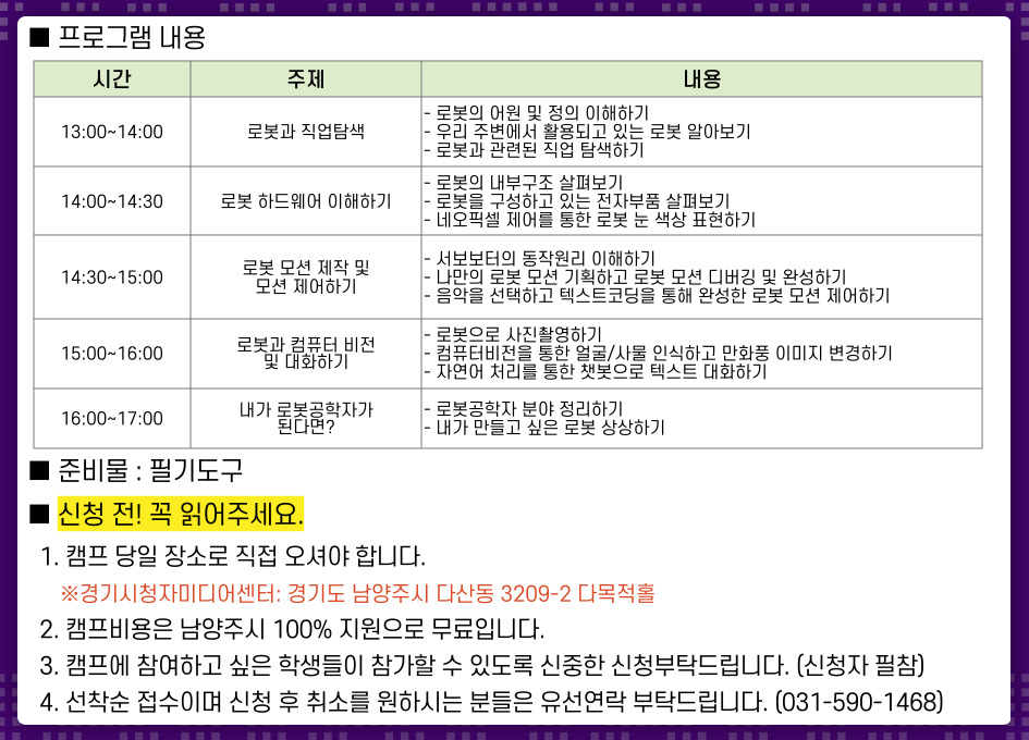 | 프로그램명 | [초등고학년진로] 로봇공학 진로캠프 |