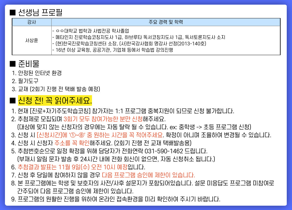 | 준비물 | 안정된 인터넷 환경, 필기도구, 교재(2회기 진행 전 택배 발송 예정) |