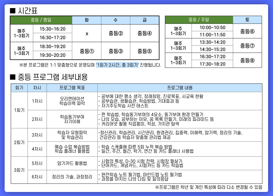 | 수업시간 | 아래 수업 내용에서 개별 시간표 확인 |