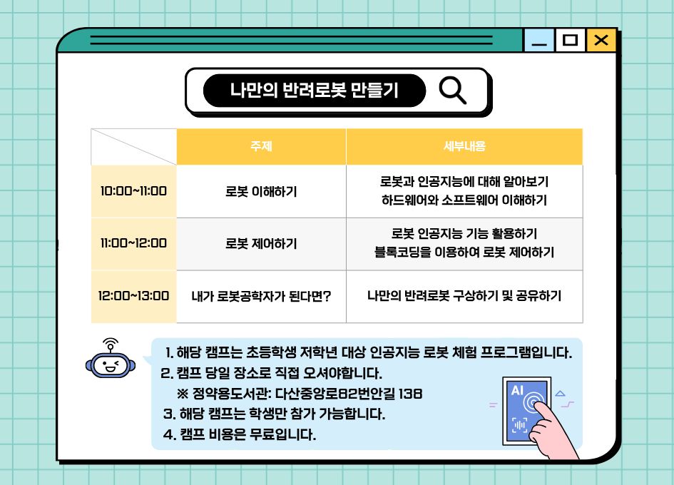 | 프로그램명 | [저학년 오전반] 2026년 로봇공학 진로캠프 |