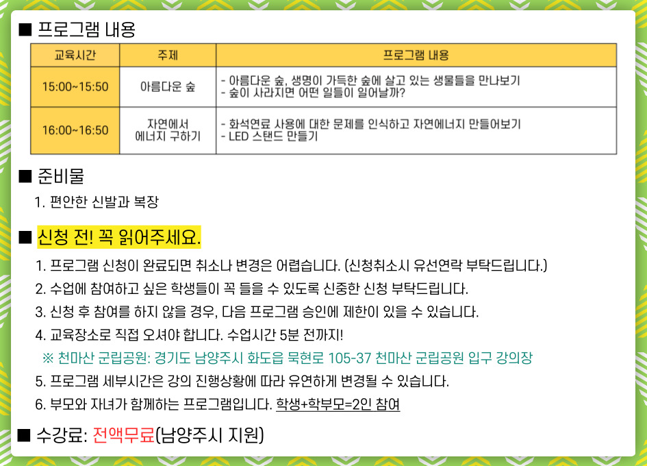 | 모집연령 | 8 ~ 10세 초등학교 1~3학년과 보호자 |