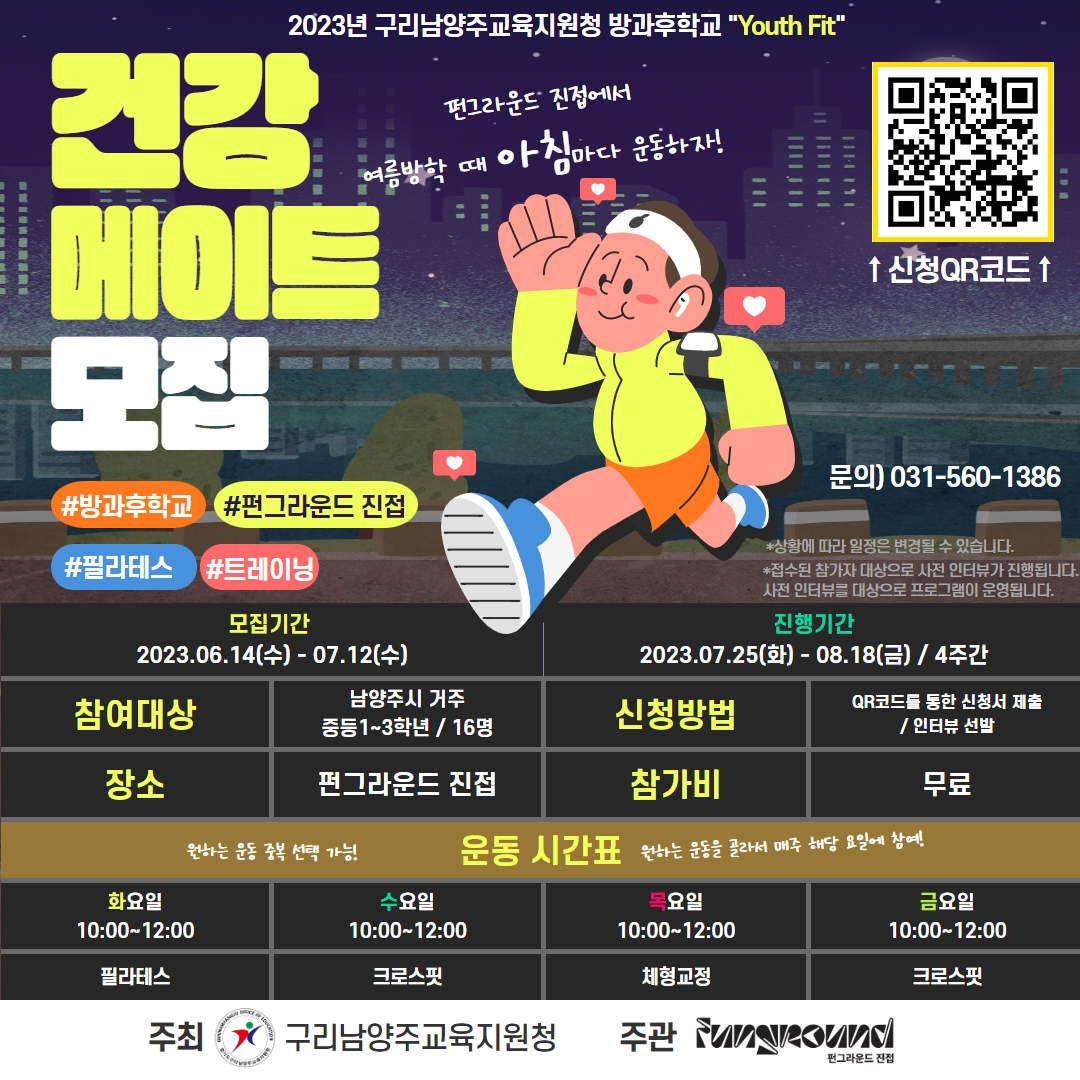 2023년 방과후학교 "Youth Fit" 참가자모집 (운동부문) - 모집기간 : 2023. 6. 14.(수) ~ 7. 12.(수) 까지 - 활동대상 : 남양주시 거주 또는 재학중인 14~16세 청소년 / 각 요일별 16명(중복신청 가능) - 활동내용 : 여름방학 기간 내 체력증진활동(운동) - 활동혜택 : 출석률 80% 이상 시 인생프로필 및 건강수료증 발급 - 신청방법 : 온라인(구글폼) 신청 https://forms.gle/WcWjZcTkaNVKcxFX7 - 문의 : ☎031-560-1386 |