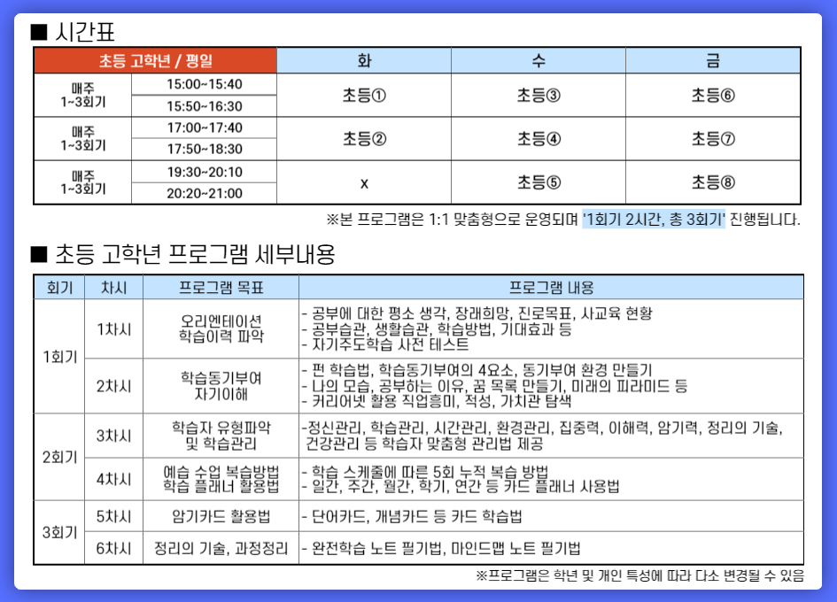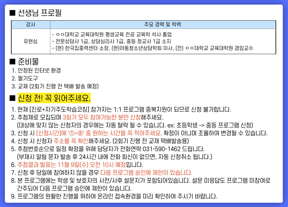 준비물 안정된 인터넷 환경, 필기도구, 교재(2회기 진행 전 택배 발송 예정)