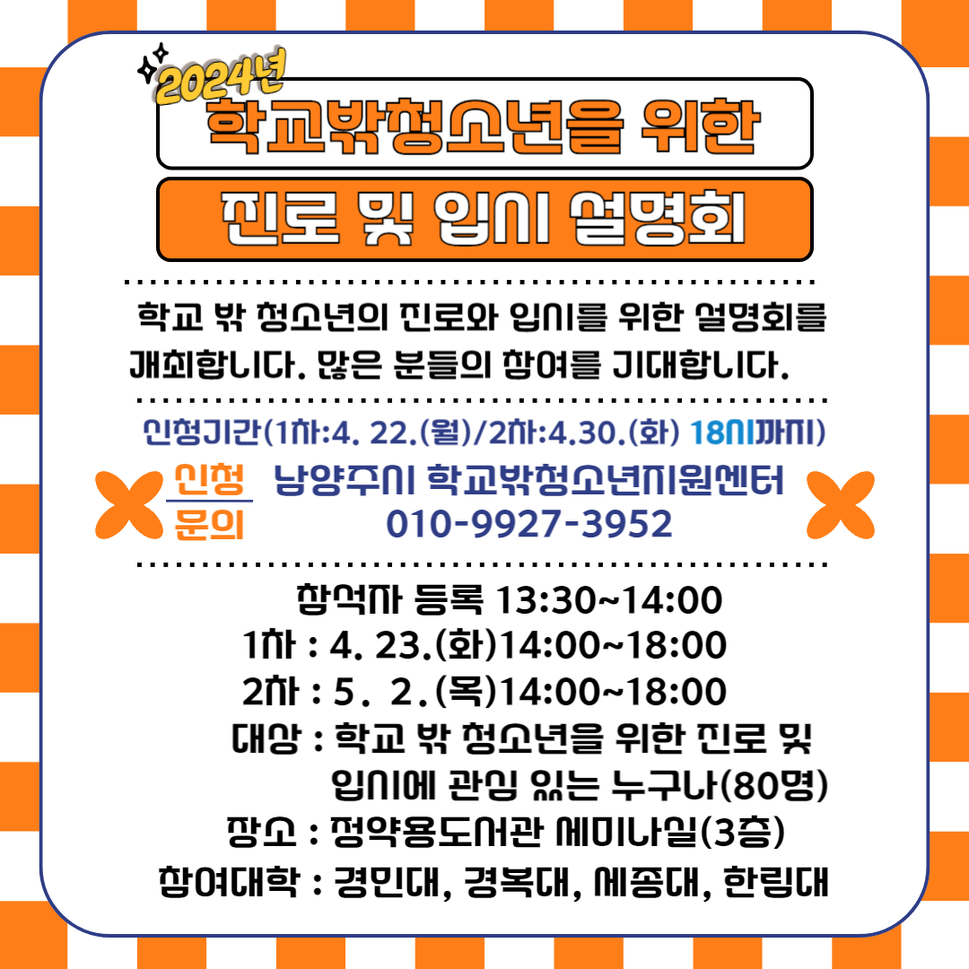 상담복지센터 학교 밖 청소년을 위한 진로 및 입시 설명회 작성자 청소년상담복지센터 등록일자 2024년 4월 17일 15시 42분 0초 조회 396 학교 밖 청소년을 위한 진로 및 입시 설명회 안내 입니다관심있는 분들의 많은 참여를 바랍니다.(신청 및 문의)남양주시 학교밖청소년지원센터010-9927-3952 포스터(입시설명회).jpg [ Size : 493.05KB, Down : 123 ] 미리보기 다운로드 목록보기
