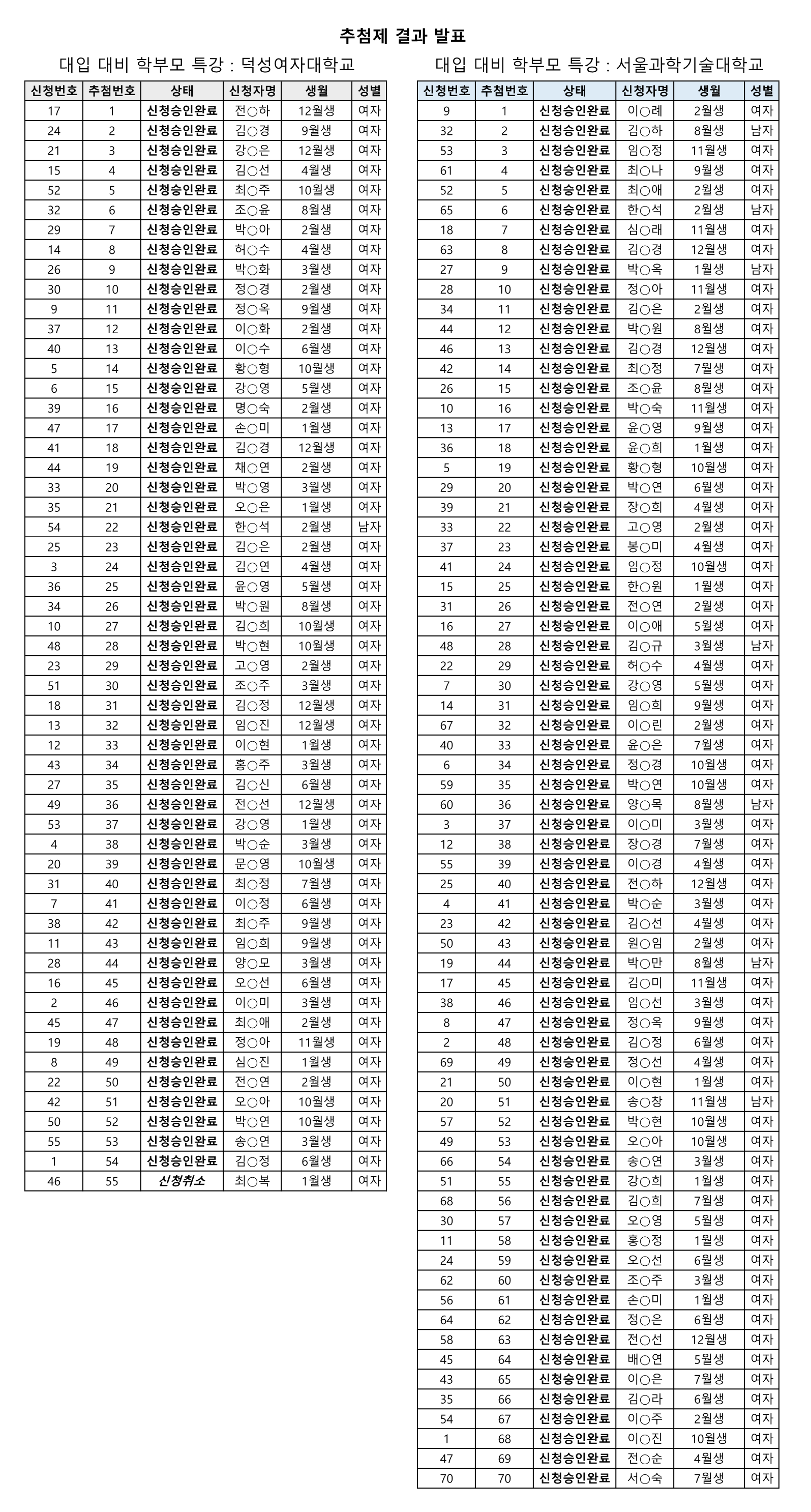 추첨 결과를 아래와 같이 공지하오니 확인 부탁드립니다.