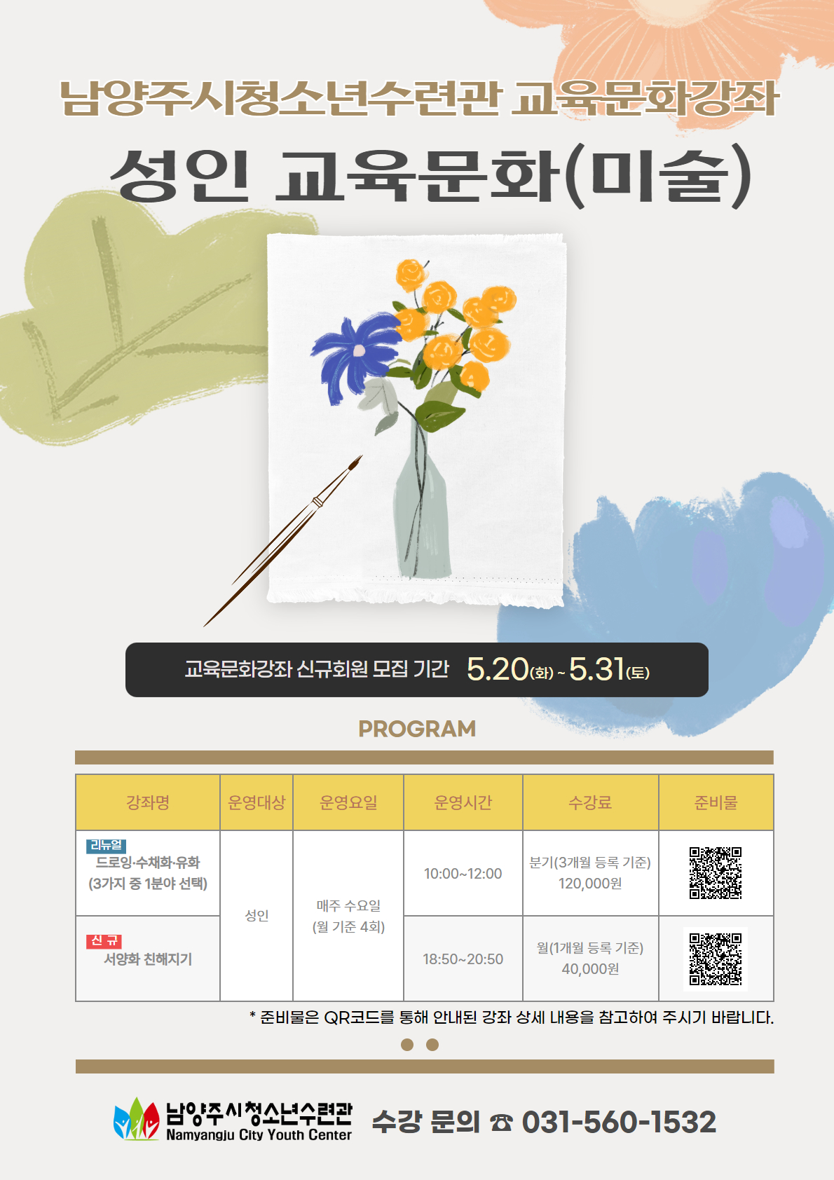 청소년수련관 남양주시청소년수련관 교육문화강좌 성인 미술 강좌 개설 안내 작성자 청소년수련관 등록일자 2025년 5월 23일 19시 6분 57초 조회 403 안녕하세요, 남양주시청소년수련관입니다.성인 교육문화 강좌 중 미술 강좌 개설 정보를 알려드리오니 많은 관심과 참여 부탁드립니다.감사합니다.문의 : 031-560-1532 미술 강좌 홍보포스터 (22).jpg [ Size : 851.43KB, Down : 231 ] 미리보기 다운로드 목록보기