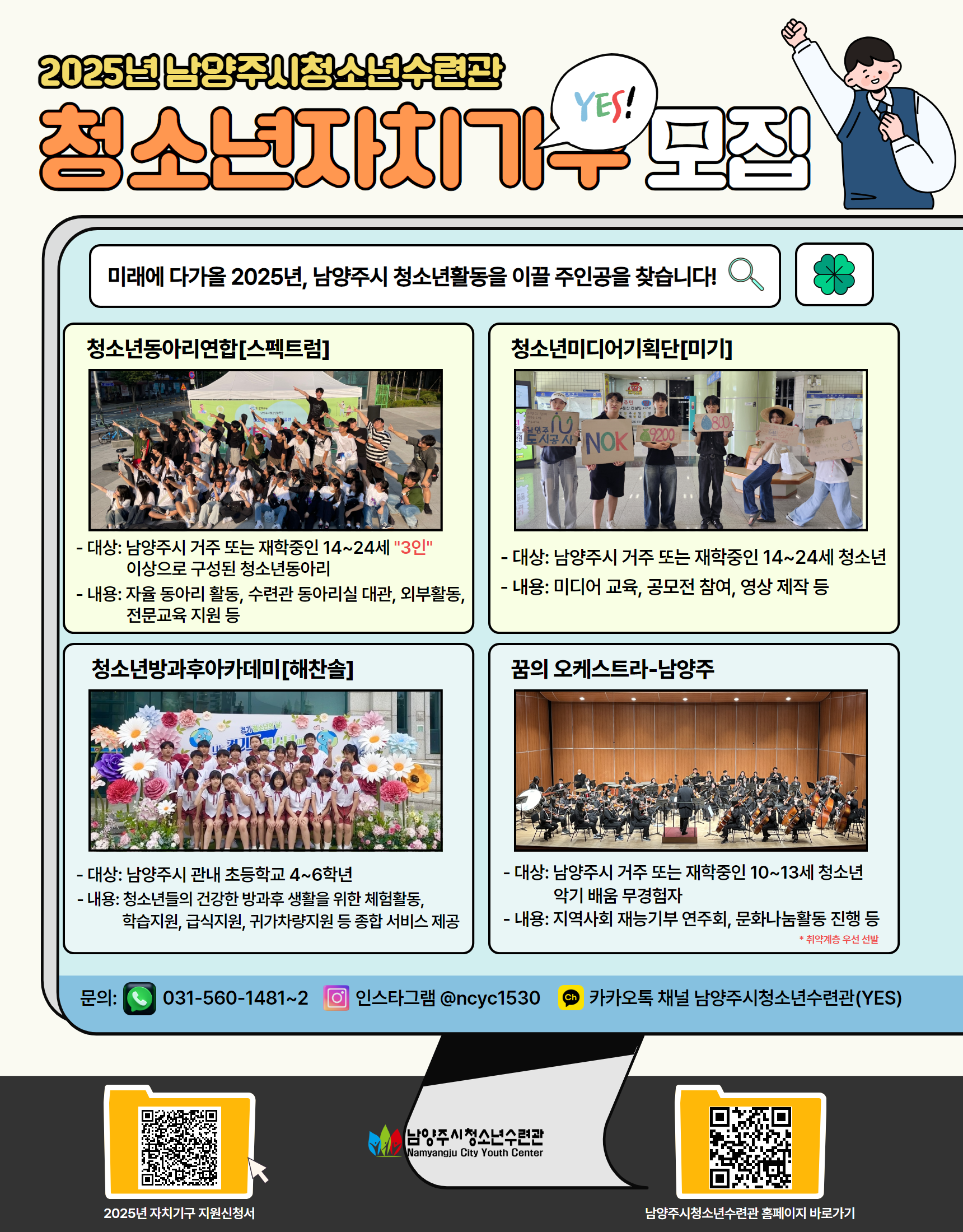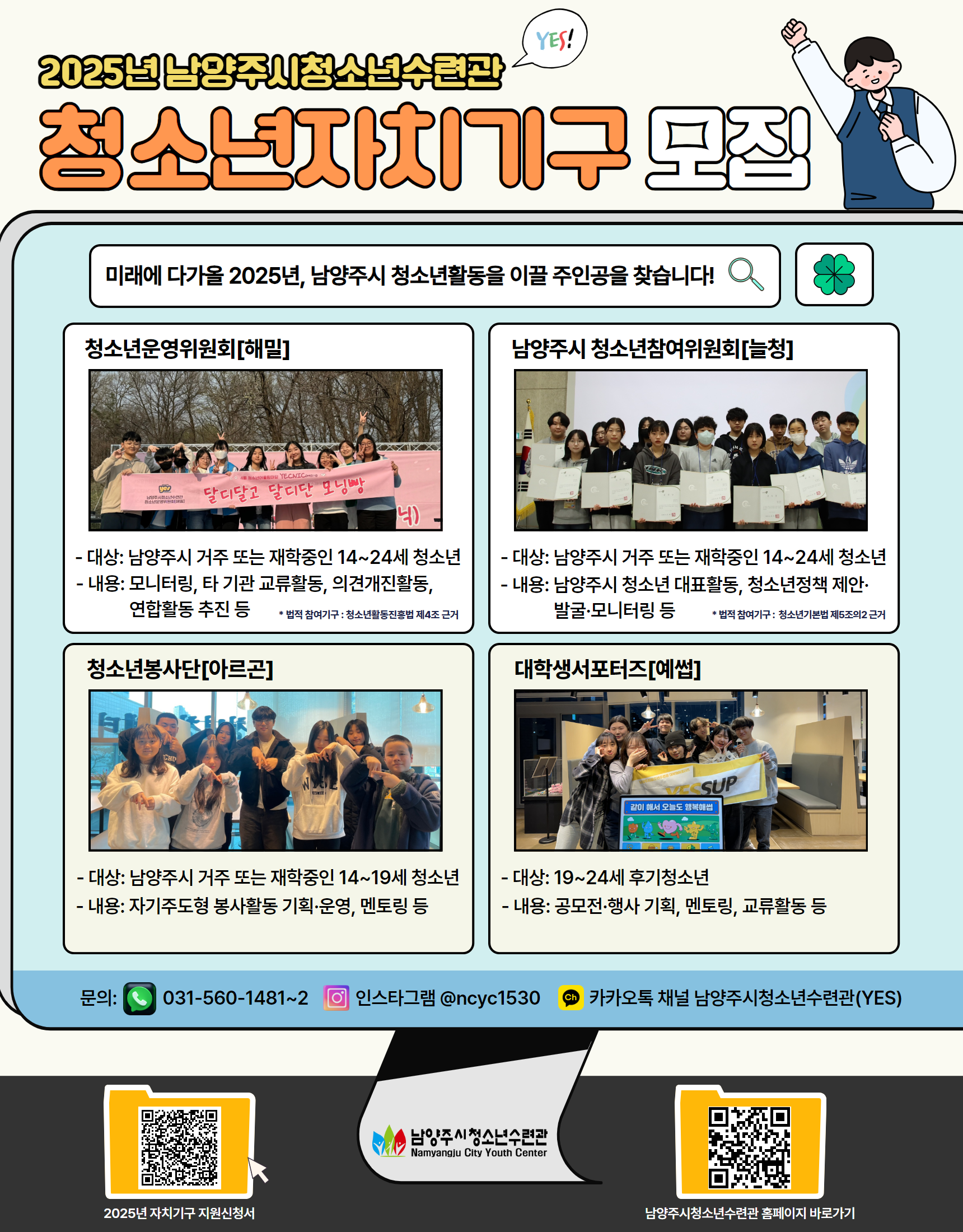 공지 청소년수련관 2025년 청소년자치기구 모집 작성자 청소년수련관 등록일자 2024년 11월 15일 17시 1분 22초 조회 5,971 1.png [ Size : 2.07MB, Down : 641 ] 미리보기 다운로드 2.png [ Size : 2.32MB, Down : 593 ] 미리보기 다운로드 목록보기