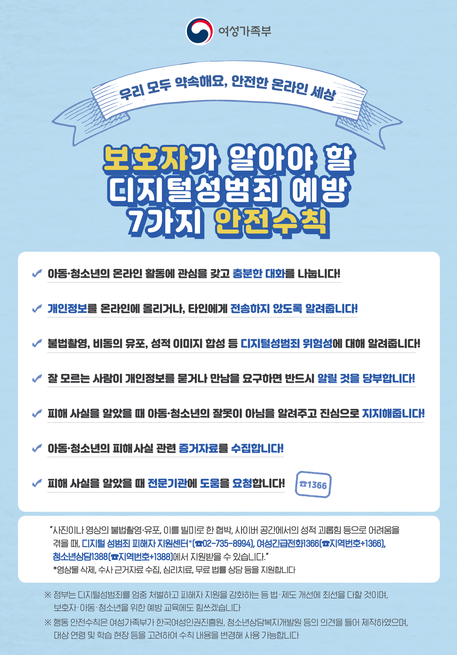 청소년수련관 [캠페인] <아동·청소년, 보호자>가 알아야할 디지털성범죄 예방 안전수칙 작성자 청소년수련관 등록일자 2020년 4월 29일 0시 0분 0초 조회 568 2. ★보호자 안전수칙_최종.png [ Size : 577.46KB, Down : 356 ] 미리보기 다운로드 목록보기