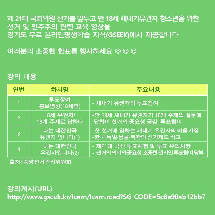 청소년수련관 제21대 국회의원 선거 관련 <새내기 유권자를 위한 선거이야기> 작성자 청소년수련관 등록일자 2020년 4월 14일 0시 0분 0초 조회 587 슬라이드2.JPG [ Size : 62.9KB, Down : 272 ] 미리보기 다운로드 목록보기