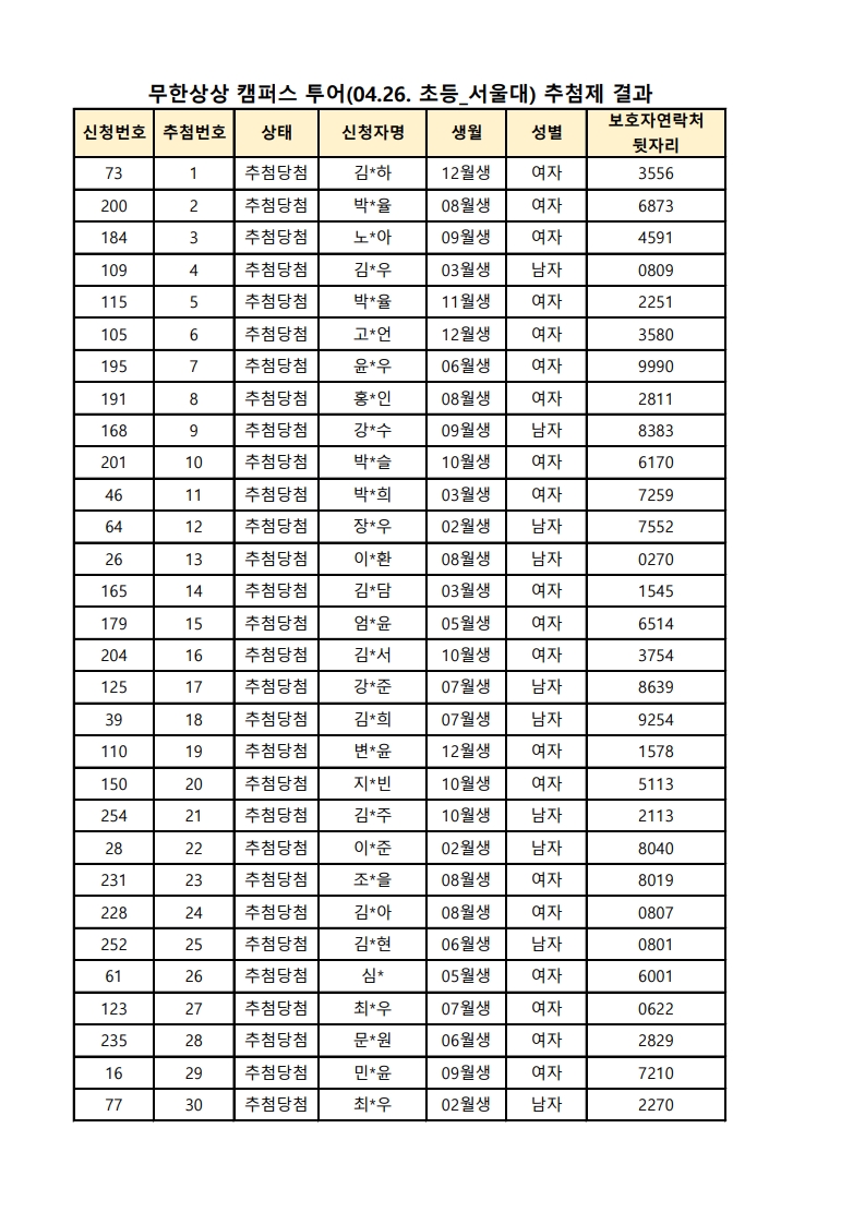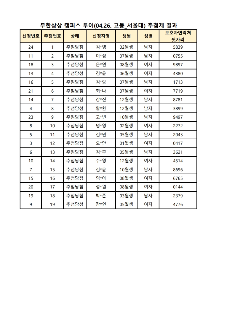 ★04.26. 고등부 신청 인원 미달로 인해 해당일 초등부에서 추가 추첨하였으니 참고하여 주시기 바랍니다★