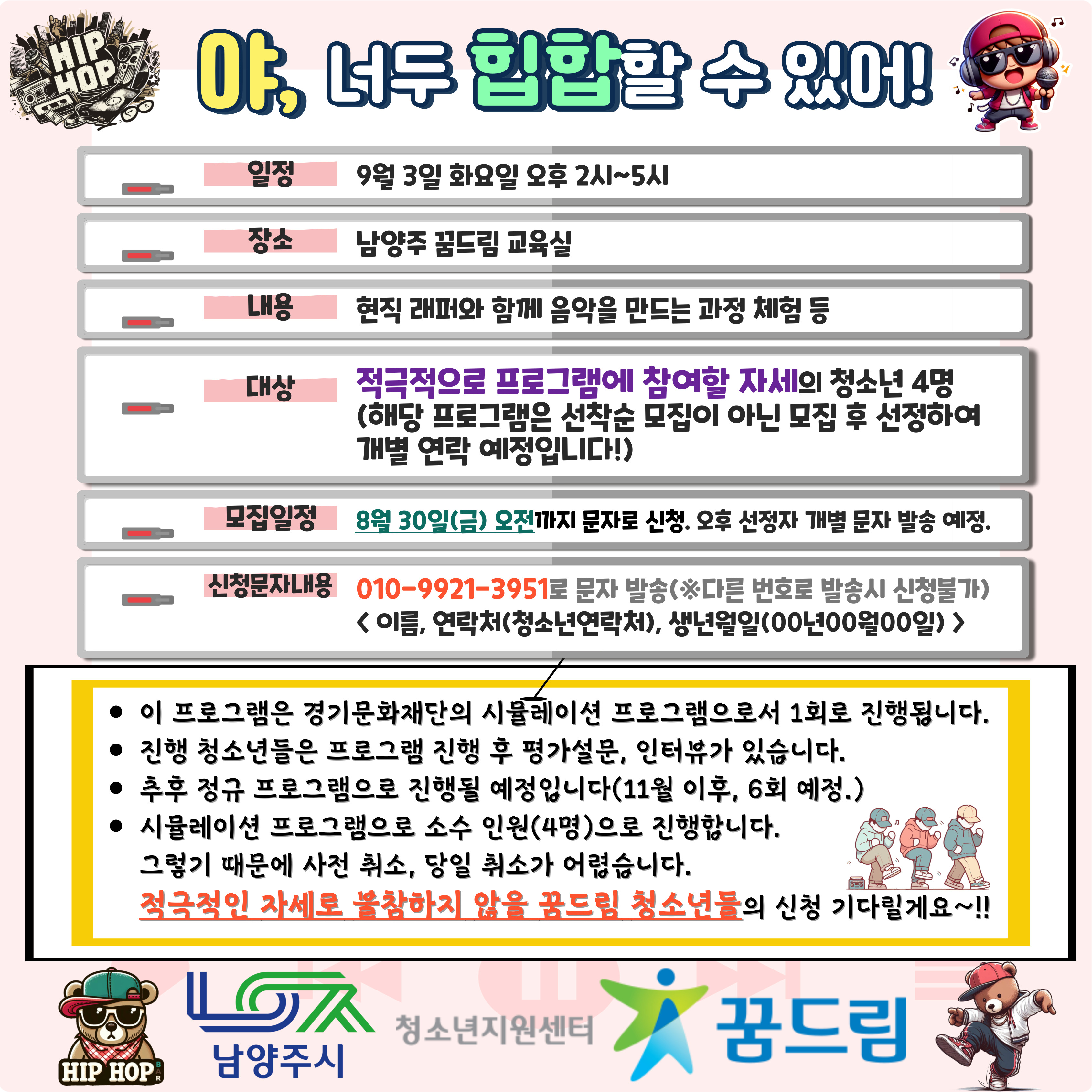 상담복지센터 남양주 꿈드림 힙합 프로그램 '야, 너두 힙합 할 수 있어!' 모집 안내(시뮬레이션 프로그램) 작성자 청소년상담복지센터 등록일자 2024년 8월 26일 19시 9분 56초 조회 325 남양주 꿈드림에서 힙합 프로그램 '야, 너두 힙합 할 수 있어!' 모집합니다!이 프로그램은 경기문화재단에서 지원되며 시뮬레이션 프로그램으로 1회 진행됩니다.1회 진행 후 정식 프로그램 6회 진행되기 위한 사전 프로그램입니다. 프로그램 종료 후 설문조사 작성과 인터뷰가 있습니다.적극적으로 참여할 남양주 꿈드림 친구들의 많은 신청 기다릴게요~!! 남양주 꿈드림 힙합프로그램 모집 포스터 SNS업로드용.jpg [ Size : 1.6MB, Down : 113 ] 미리보기 다운로드 목록보기
