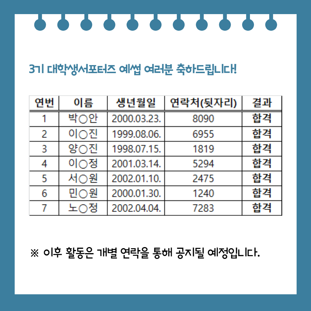청소년수련관 [예썹] 2021년 3기 대학생서포터즈 예썹 최종 합격자 안내 작성자 청소년수련관 등록일자 2021년 3월 9일 0시 0분 0초 조회 504 3기 예썹 최종합격 안내_002.jpg [ Size : 399.71KB, Down : 348 ] 미리보기 다운로드 목록보기