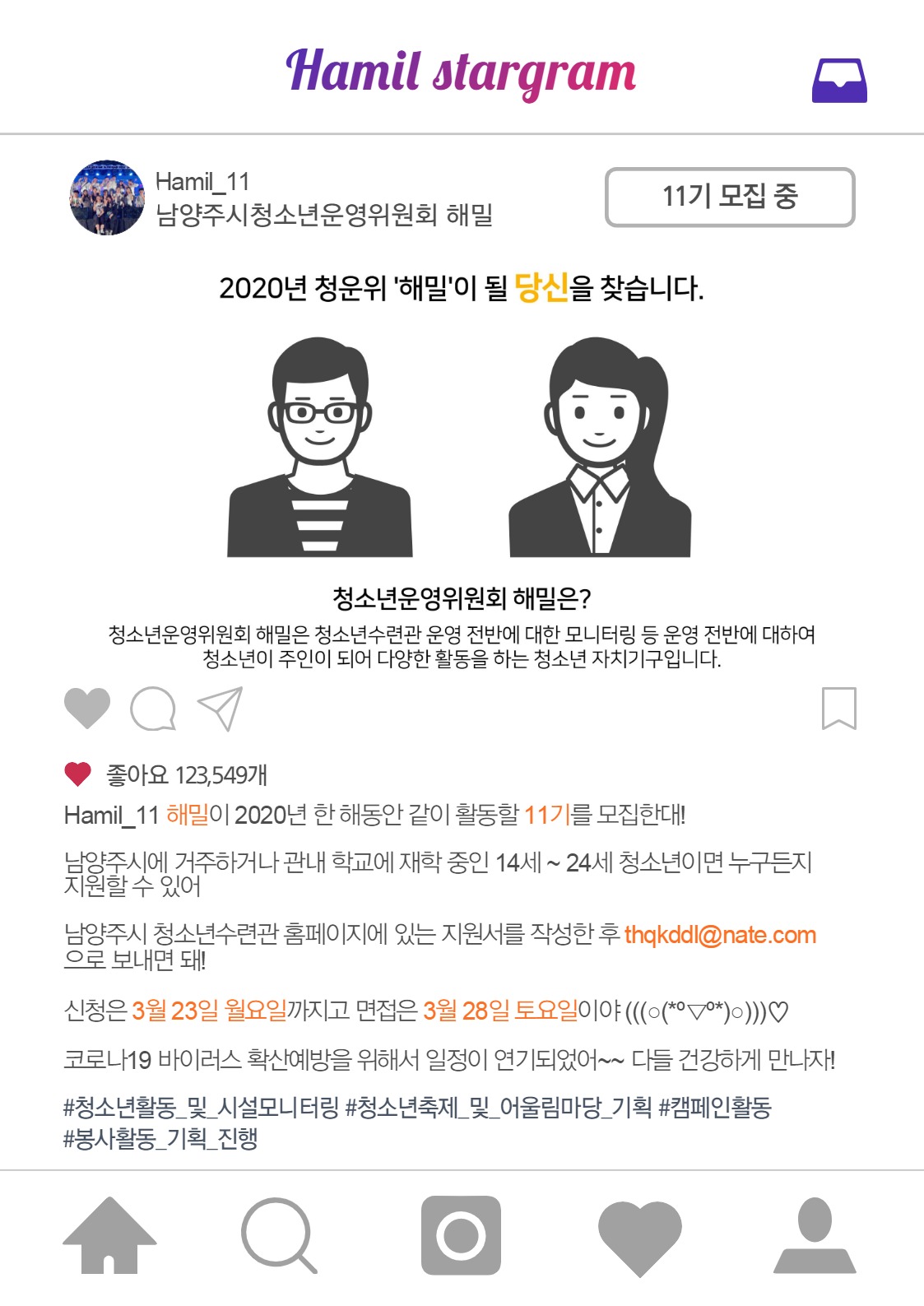 청소년수련관 2020년 남양주시청소년수련관 청소년운영위원회 [해밀] 11기 신규 위원 모집 안내 작성자 청소년수련관 등록일자 2020년 2월 4일 0시 0분 0초 조회 854 KakaoTalk_20200319_171636414.jpg [ Size : 215.31KB, Down : 622 ] 미리보기 다운로드 목록보기