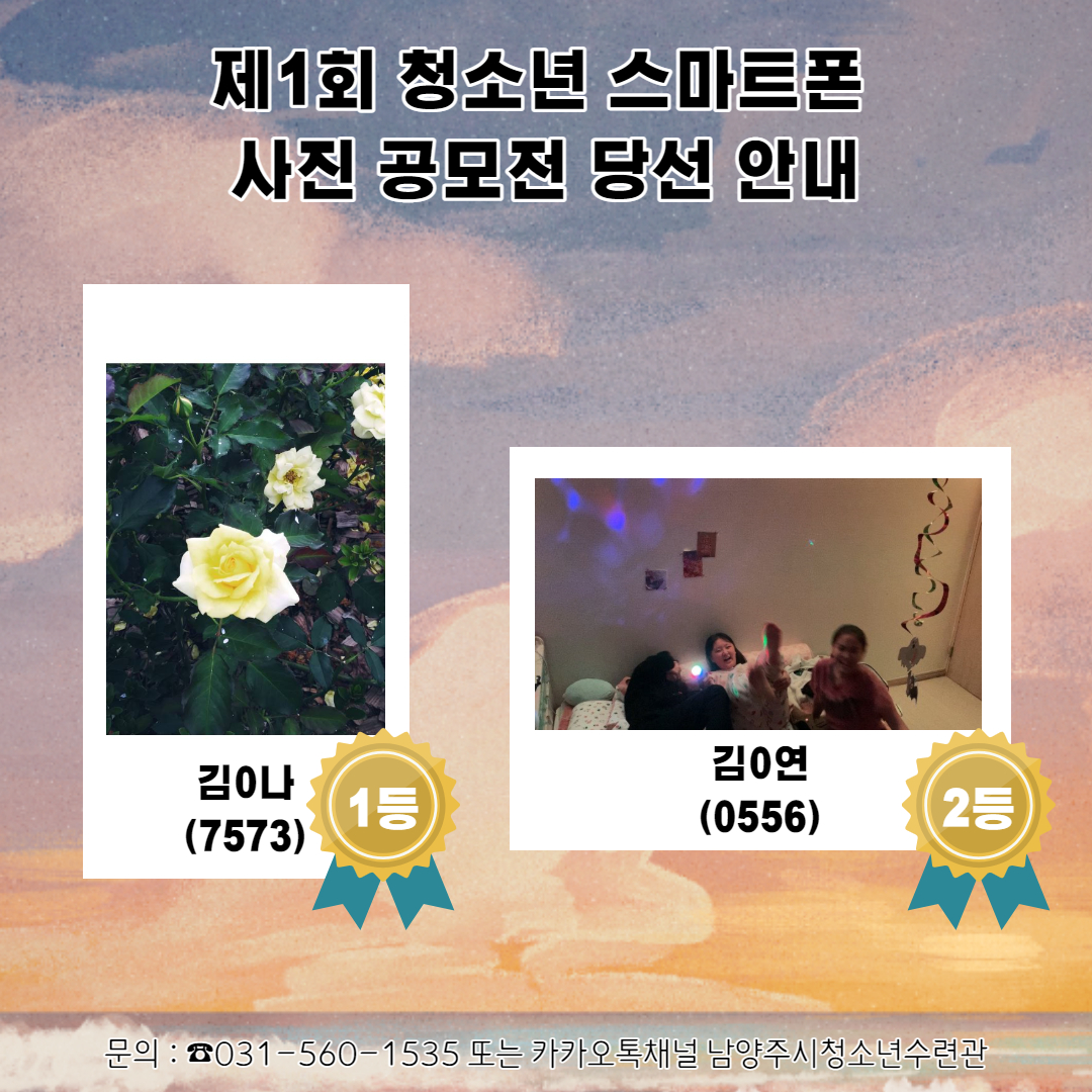 청소년수련관 [서포터즈] 제1회 청소년스마트폰 사진 공모전 결과 안내 작성자 청소년수련관 등록일자 2020년 12월 11일 0시 0분 0초 조회 598 예썹 공모전 당선 안내_2.jpg [ Size : 1017.99KB, Down : 365 ] 미리보기 다운로드 목록보기