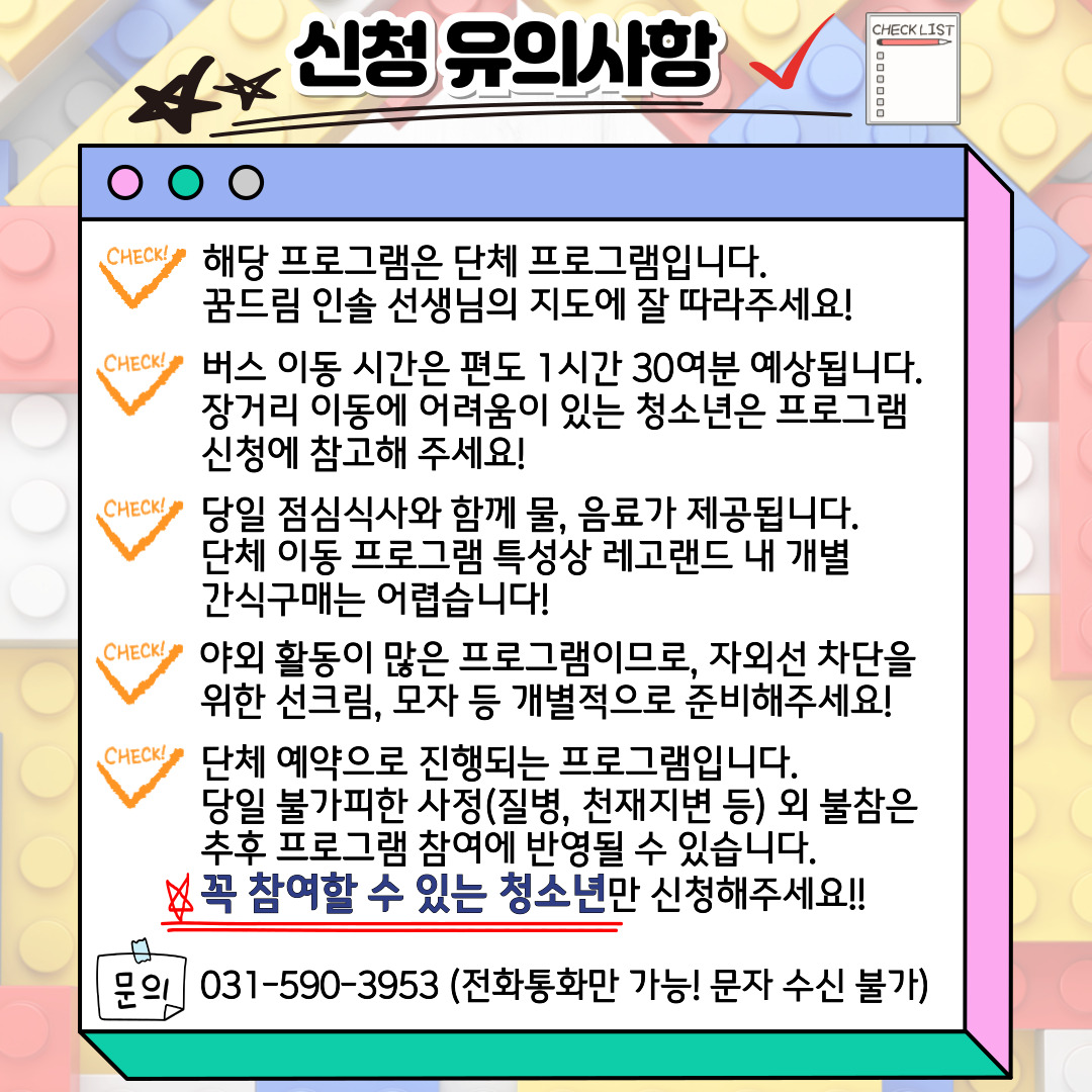 상담복지센터 남양주 꿈드림 5월 레고랜드 체험 모집 안내 작성자 청소년상담복지센터 등록일자 2024년 5월 13일 17시 43분 19초 조회 412 5월 특별문화 체험 기획! 레고랜드 체험에 참여할 남양주 꿈드림 청소년을 모집합니다~ 장소와 일시, 유의사항을 참고해서 많이 신청해주세요~~^^ 1.jpg [ Size : 371.24KB, Down : 150 ] 미리보기 다운로드 2.jpg [ Size : 315.63KB, Down : 133 ] 미리보기 다운로드 목록보기