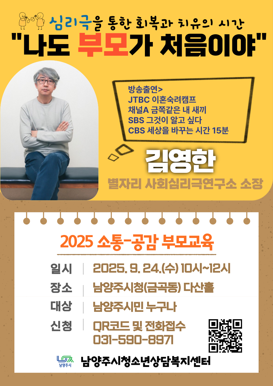 상담복지센터 2025 소통-공감 부모교육 "나도 부모가 처음이야" 작성자 청소년상담복지센터 등록일자 2025년 8월 12일 9시 22분 8초 조회 320 하반기 부모특강.png [ Size : 360.55KB, Down : 199 ] 미리보기 다운로드 목록보기