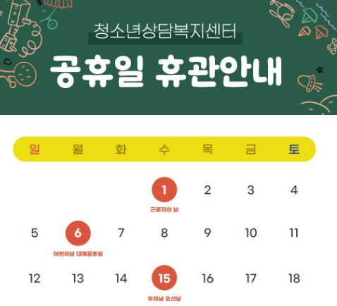 상담복지센터 2024년 5월 휴관일 안내 작성자 청소년상담복지센터 등록일자 2024년 4월 16일 17시 14분 1초 조회 295 공휴일 휴관안내(2024년 5월).png [ Size : 60.64KB, Down : 126 ] 미리보기 다운로드 목록보기