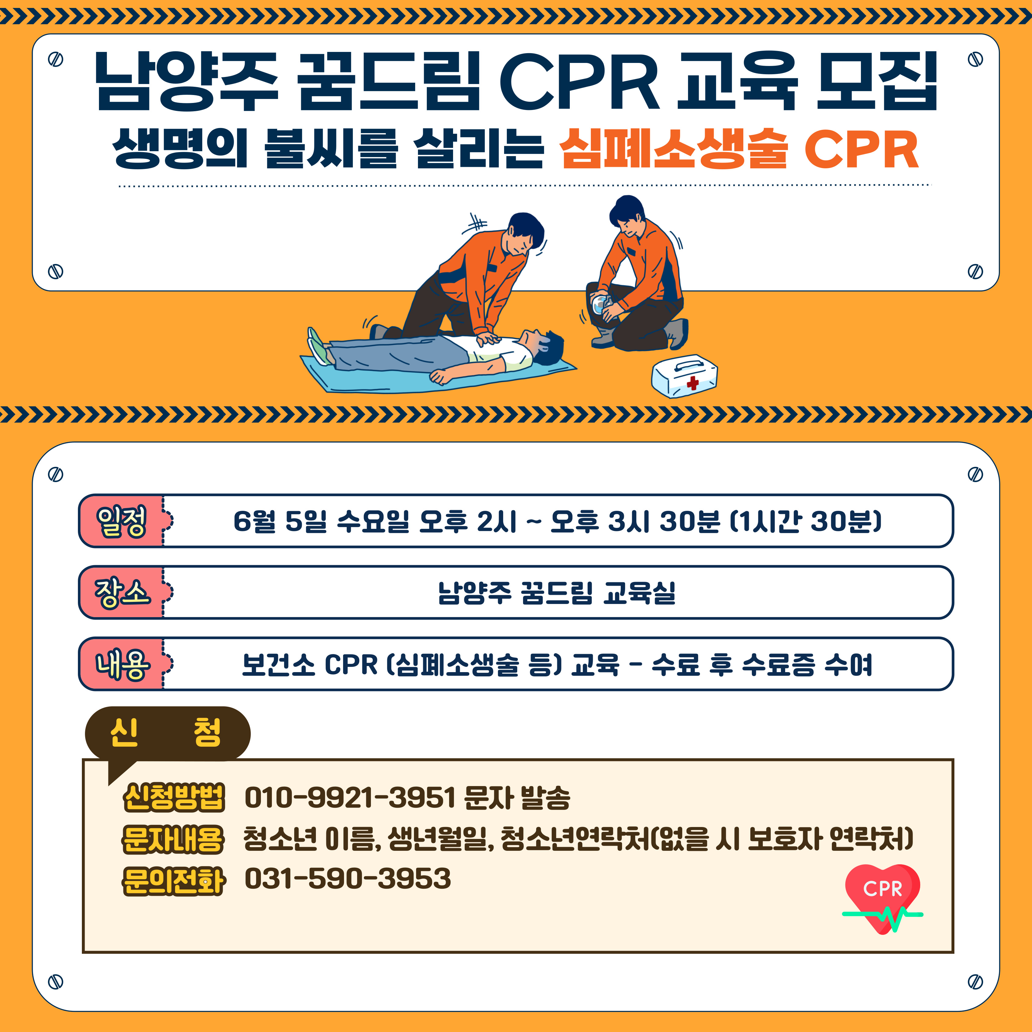 상담복지센터 남양주 꿈드림 CPR 심폐소생술 교육 모집 안내 작성자 청소년상담복지센터 등록일자 2024년 5월 29일 18시 27분 54초 조회 636 남양주 꿈드림에서 CPR 심폐소생술 교육을 진행합니다~ 남양주 보건소에서 실시를 하는데요~ 배워두면 언제 어디서든지 유용하게 활용할 수 있는 심폐소생술!! 남양주 꿈드림 친구들 많이 신청해주세요~!! 남양주 꿈드림 CPR 교육 모집 포스터.jpg [ Size : 1.43MB, Down : 225 ] 미리보기 다운로드 목록보기