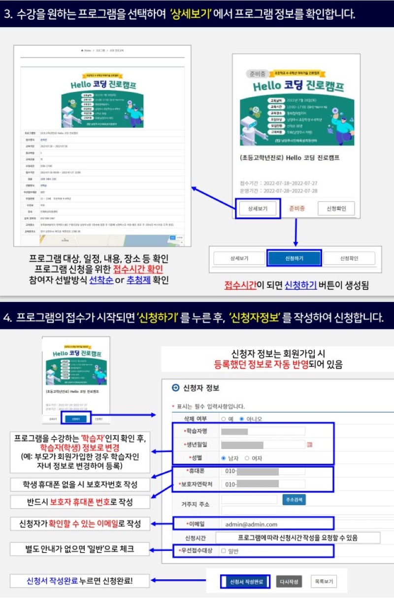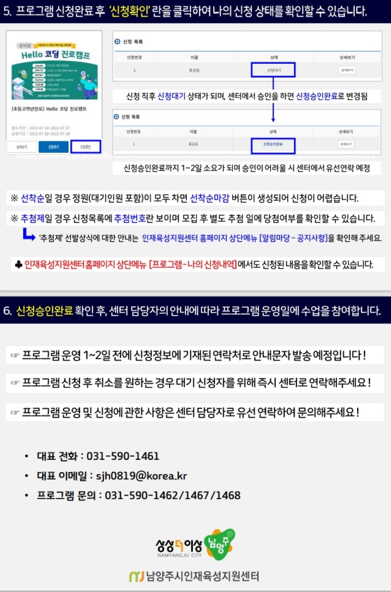 공지 인재육성지원센터 [인재육성지원센터] 진로교육 프로그램 온라인 신청방법 안내 작성자 관리자 등록일자 2022년 7월 16일 14시 2분 31초 조회 5,415 추첨제 선발방식 안내 바로가기 https://www.nyj.go.kr/youth/futurenedu/183?action=read&action-value=04364a7208f1815b1592a206ee6fed7a 프로그램 신청페이지 바로가기 https://www.nyj.go.kr/youth/futurenedu/177 신청안내1.jpeg [ Size : 408.16KB, Down : 5,561 ] 미리보기 다운로드 신청안내2.jpeg [ Size : 457.53KB, Down : 5,498 ] 미리보기 다운로드 신청안내3.jpeg [ Size : 447.05KB, Down : 5,472 ] 미리보기 다운로드 목록보기