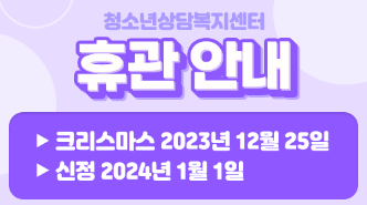상담복지센터 12월 휴관일 안내 작성자 청소년상담복지센터 등록일자 2023년 12월 4일 17시 33분 37초 조회 333 12월 휴관일 안내.png [ Size : 21.15KB, Down : 153 ] 미리보기 다운로드 목록보기