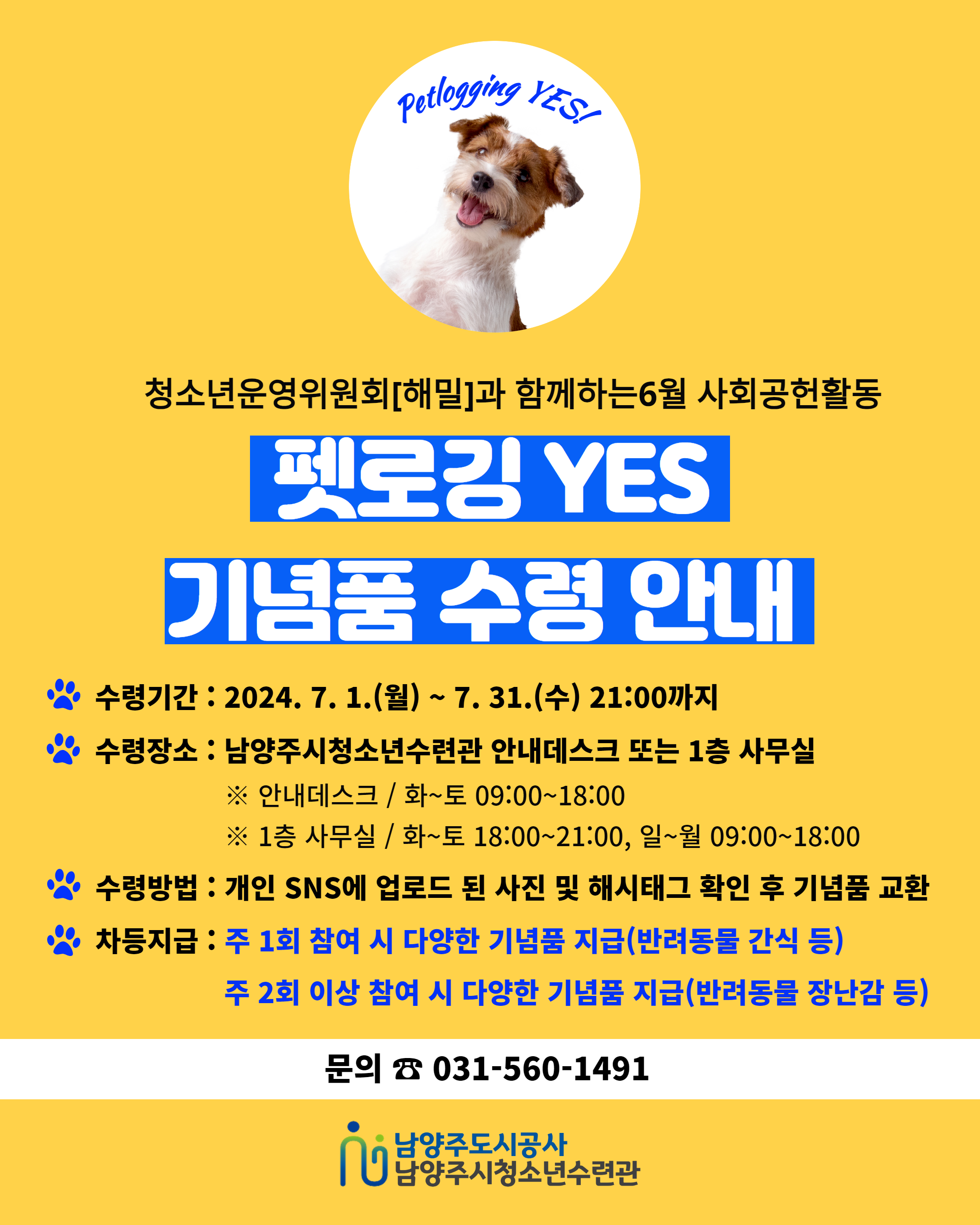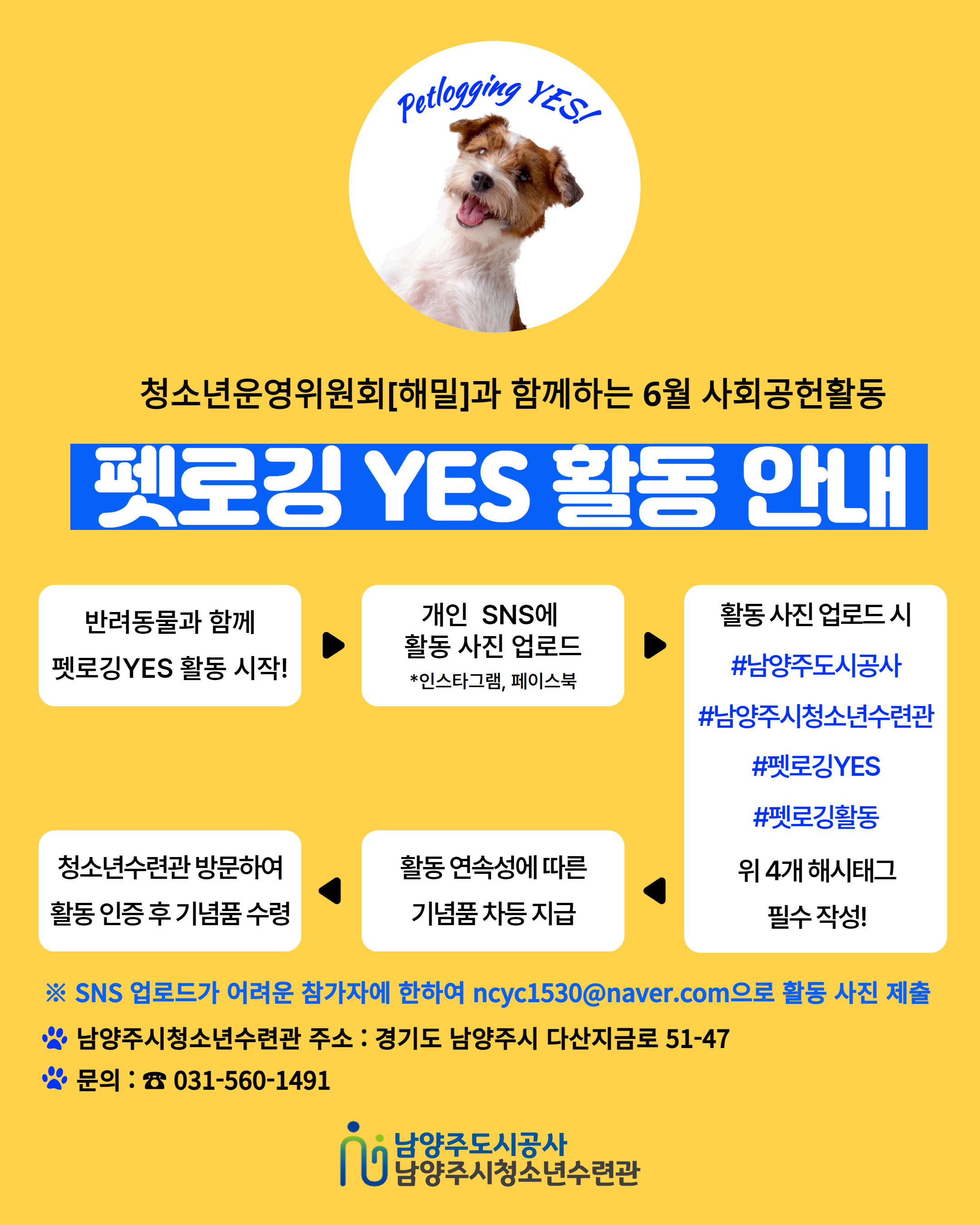 청소년수련관 청소년운영위원회[해밀]과 함께하는 6월 사회공헌활동 펫로깅 YES 활동 안내 작성자 청소년수련관 등록일자 2024년 6월 12일 16시 46분 20초 조회 343 6월 사회공헌활동_펫로깅 YES_0612 1 (1).png [ Size : 1.62MB, Down : 157 ] 미리보기 다운로드 6월 사회공헌활동_펫로깅 YES_0612 2 (1).png [ Size : 722.29KB, Down : 175 ] 미리보기 다운로드 6월 사회공헌활동_펫로깅 YES_0612 3 (1).png [ Size : 715.58KB, Down : 165 ] 미리보기 다운로드 목록보기