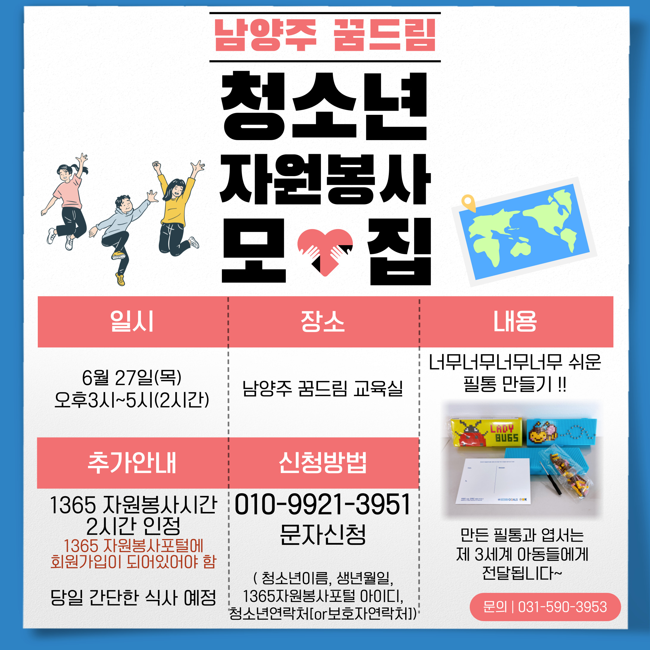 상담복지센터 남양주 꿈드림 청소년 자원봉사 모집 안내 작성자 청소년상담복지센터 등록일자 2024년 6월 13일 18시 3분 21초 조회 376 남양주 꿈드림 청소년 자원봉사 모집 포스터.jpg [ Size : 805.38KB, Down : 148 ] 미리보기 다운로드 목록보기