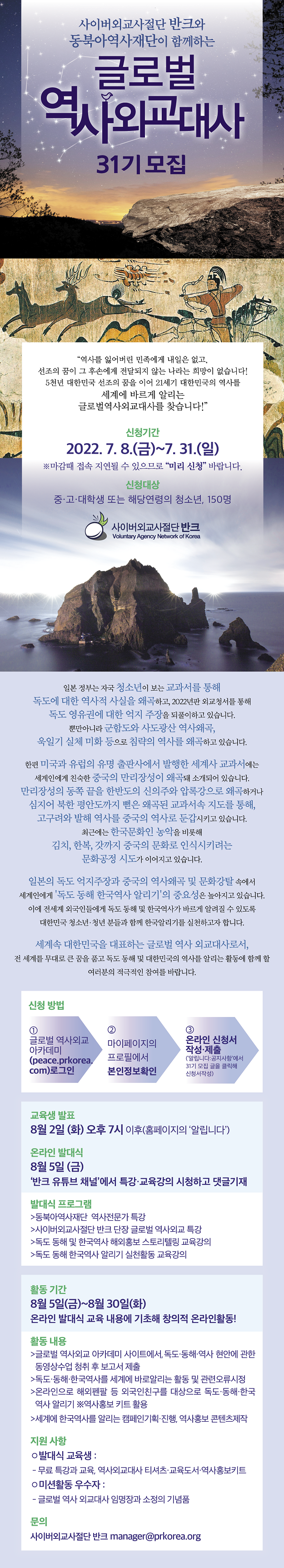 [반크]글로벌 역사 외교대사31기 모집(~7/31) 작성자 관리자 등록일자 2022년 7월 26일 10시 47분 59초 조회 286 1657752132_2348dbc72986f54439fd.png [ Size : 2.12MB, Down : 191 ] 미리보기 다운로드 목록보기