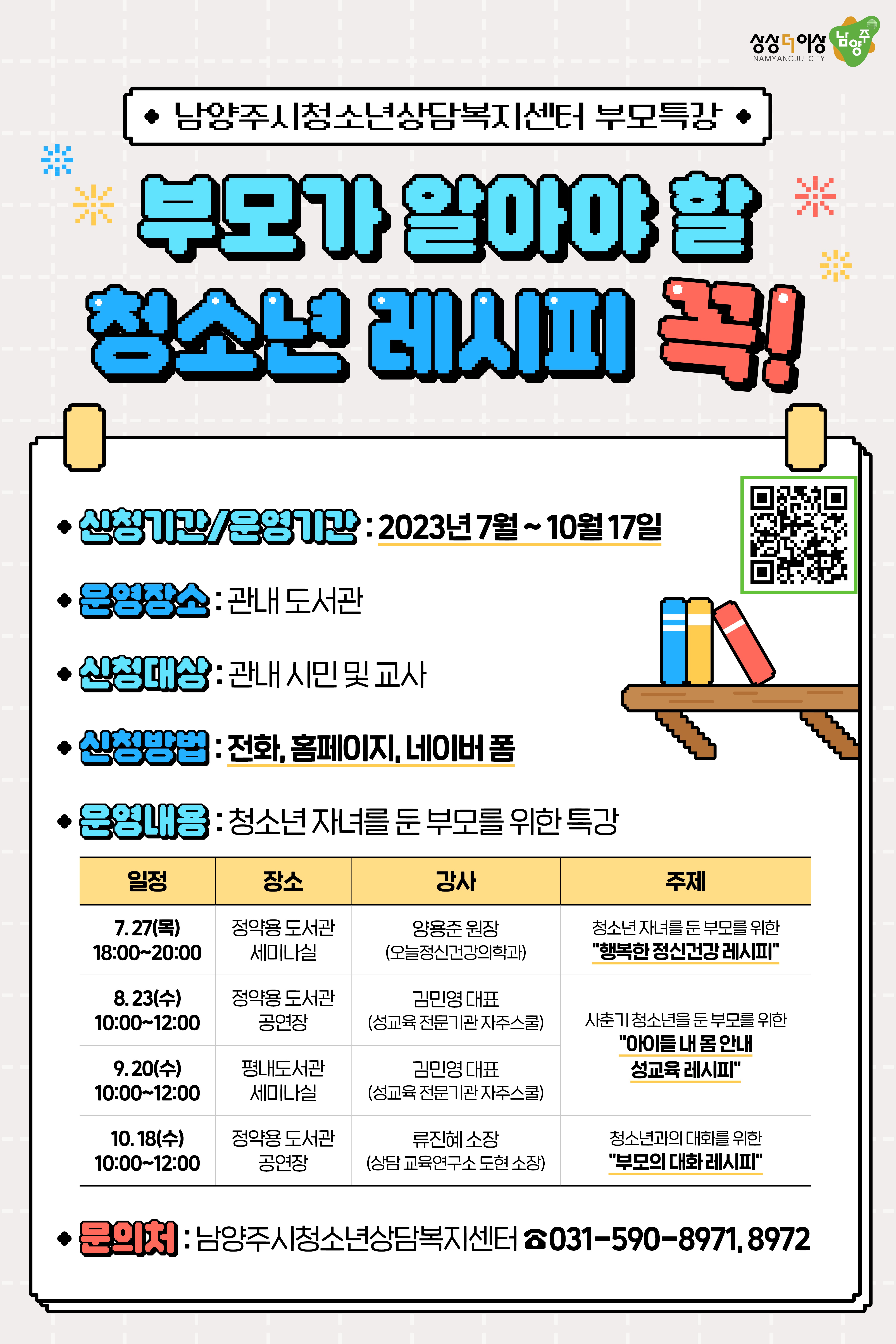 부모가 알아야 할 청소년 레시피 꼭! 자녀교육에 관심이 많으신 관내 부모님들을 위해 남양주시청소년상담복지센터에서 특강을 진행합니다. 9월 20일 진행되는 이번 특강은 김민영(성교육 전문기관 자주스쿨)대표님을 모시고 평내 도서관에서‘아이들 내 몸 안내 성교육 레시피를 주제로 특강이 진행됩니다. 신청은 전화 031-590-8971, 8972 및 https://naver.me/GpeBWdJK로 가능합니다. 많은 참여 바랍니다 |
