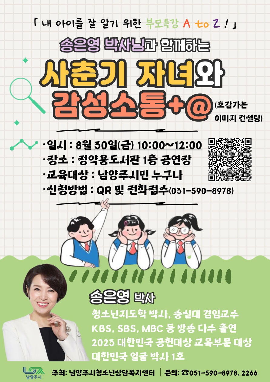 내 자녀를 잘 알기 위한 부모특강, A to Z "사춘기 자녀와 감성소통" ▷ 일정 : 8월 30일 (금) 오전 10:00-12:00 ▷ 장소 : 정약용도서관, 공연장 ▷ 주제 : 사춘기 자녀와 감성소통 ▷ 강사 : 송은영교수(숭실대학교 경영대학원) ▷ 신청방법: 온라인 접수 및 전화 접수(031-590-8978)의 ▷ 신청기간: ~ 8월 29일(목) 17시 까지 ▷ 문의 : ☎ 031) 590-8978 ▷ 기타 - 주차공간이 협소함으로 대중교통을 이용해주시기 바랍니다. - 2-3차 부모교육 주제 중복신청 가능합니다. (단, 신청자가 초과하는 경우 선착순에 따라 신청이 취소될 수 있습니다.) 많은 참여 바랍니다 ♡
