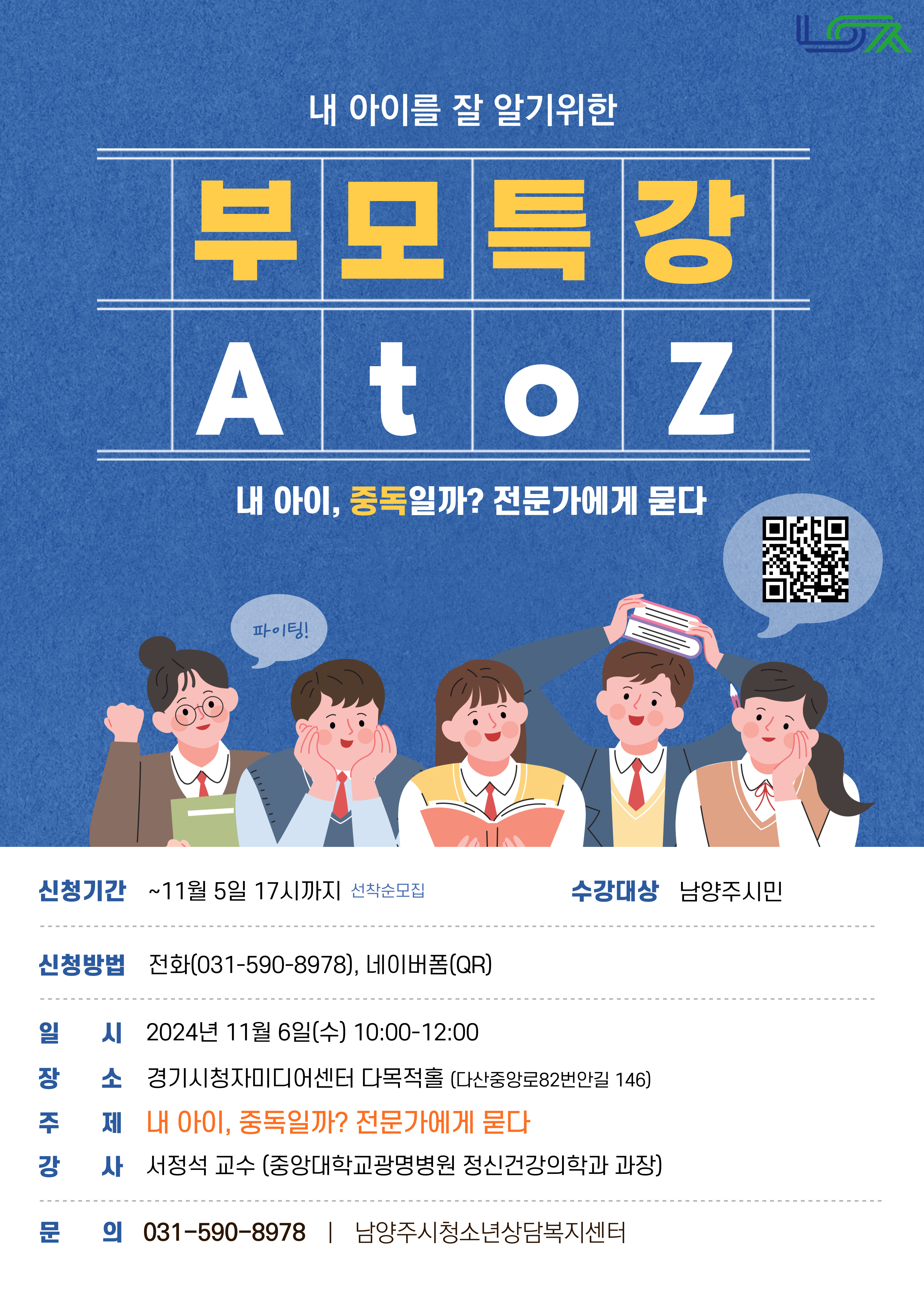 내 자녀를 잘 알기 위한 부모특강, A to Z "내 아이, 중독일까? 전문가에게 묻다" ▷ 일정 : 11월 6일 (수) 오전 10:00-12:00 ▷ 장소 : 경기시청자미디어센터 다목적홀 ▷ 주제 : 내 아이, 중독일까? 전문가에게 묻다. ▷ 강사 : 서정석 교수(중앙대광명병원 정신건강의학과 교수) ▷ 신청방법: 온라인 접수 및 전화 접수(031-590-8978) ▷ 신청기간: ~ 11월 5일(목) 17시 까지 ▷ 문의 : ☎ 031) 590-8978 ▷ 기타 - 주차공간이 협소함으로 대중교통을 이용해주시기 바랍니다. - 2-3차 부모교육 주제 중복신청 가능합니다. (단, 신청자가 초과하는 경우 선착순에 따라 신청이 취소될 수 있습니다.) 많은 참여 바랍니다 ♡ |